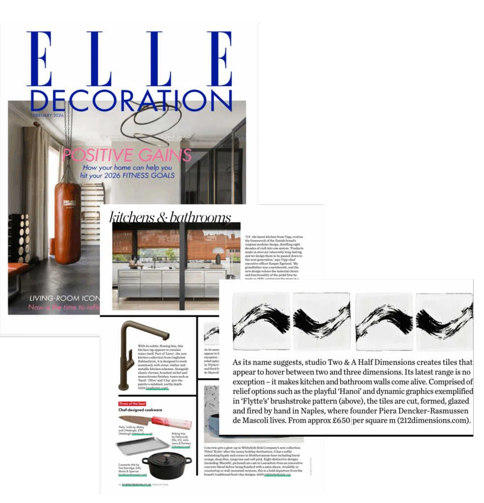 “Two & A Half Dimensions handmade ceramic tiles meld the organic beauty of clay with a Scandinavian-inspired minimalist aesthetic. Drawing on forms from the built and natural environment, each made-to-order tile sits between the two and three-dimensional, the relief designs casting shadows which create ever changing landscapes.”